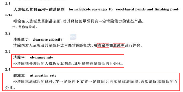 根據(jù)國(guó)家標(biāo)準(zhǔn),驗(yàn)證人造板甲醛清除劑的清除能力有兩個(gè)指標(biāo)非常重要,一個(gè)是測(cè)定24小時(shí)效果的“甲醛清除率”,還有一個(gè)測(cè)定長(zhǎng)期效果的“衰減率”。“衰減率”就是在7天之后,再測(cè)一次甲醛清除率,然后把7天后的甲醛清除率與24小時(shí)的甲醛清除率作比較,看7天后清除甲醛的效果降低了多少,計(jì)算出來(lái)的降低比率就是“衰減率”。
